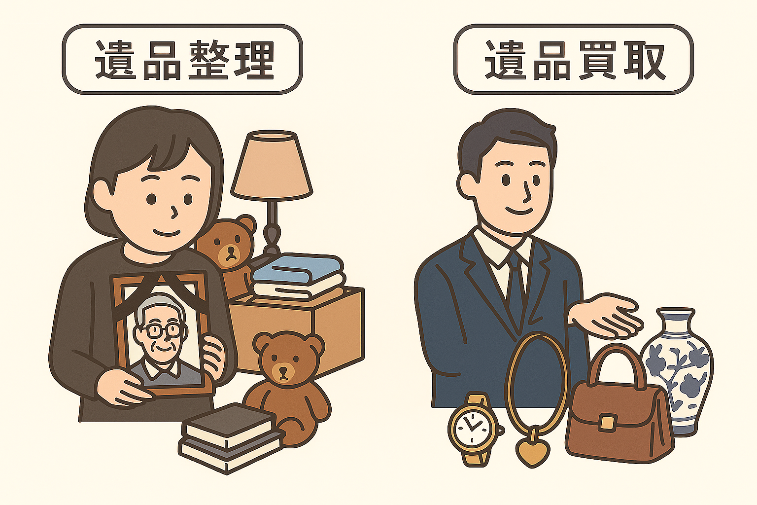 遺品整理を業者に依頼する場合、大きく「遺品整理業者」と「買取専門業者」に分けられます。